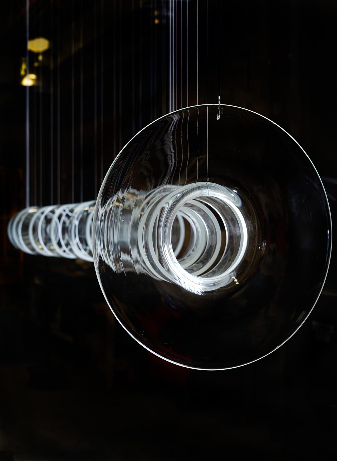 Ancestral memory I is a suspended glass installation fabricated during Maree Clarke’s residency at Canberra Glassworks in 2019. The installation references the migratory paths that short- finned eels take within sewers and underground waterways across and underneath Melbourne. The breeding grounds of these eels are believed to be somewhere in the Coral Sea. During their journey from the tropics to Victorian waterways, the eels metamorphose into clear and tubular animals, before taking on their final pigmented form. Aboriginal people from south-east Australia have traditionally observed and interacted with eels as signs of seasonal change, as well as sources of food.