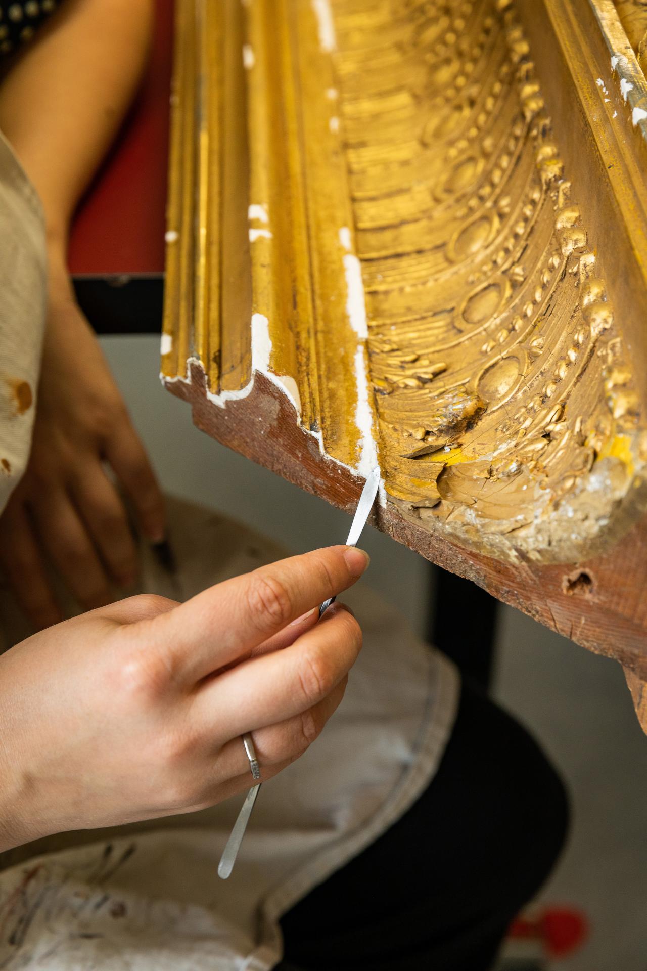 The commanding gilded frame surrounding Elizabeth Thompson’s The 28th Regiment at Quatre Bras (1875) is a simplified trophy frame. This style of frame uses motifs and symbols relevant to the painting it houses to tie the painting to a particular myth, event or family or, as is the case here, military engagements of the 28th (North Gloucestershire) Regiment of Foot.