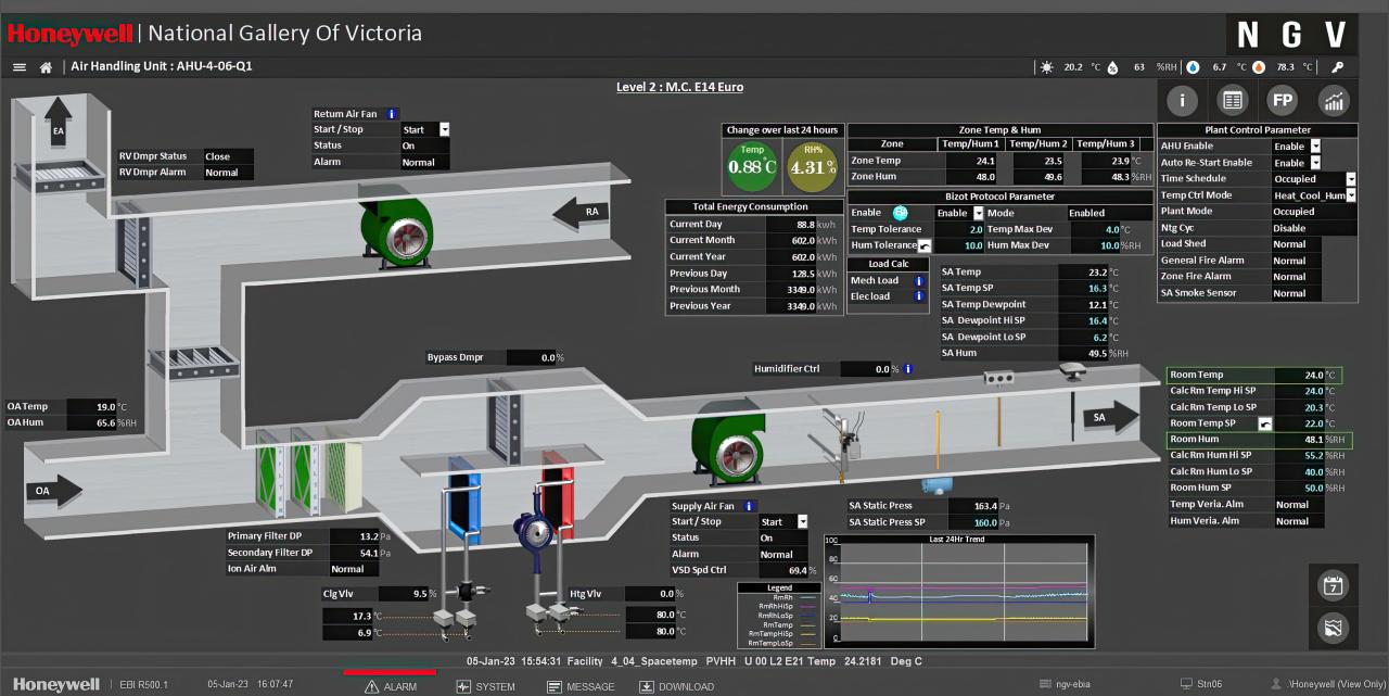 Honeywell Building Automation System (BAS) diagram for one of the NGVI galleries programmed to Bizot Green Protocol settings