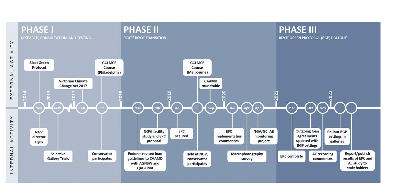 Loan agreements contain climatic requirements for works being lent from one institution to another, and conventionally these requirements stipulate tightly controlled environmental conditions. There has recently been a coordinated effort between major Australian lending institutions to change lending and borrowing practices nation-wide to reduce the environmental impact of exhibitions. In September 2018, in a meeting of the Heads of Conservation from Queensland Art Gallery and Museum of Art (QAGOMA), Art Gallery of New South Wales (AGNSW) and the NGV, it was agreed that the BGP and the nationally-developed Australian Institute for the Conservation of Cultural Materials environmental guidelines (AICCM 2018) would be adopted for collections and loans. This was later submitted to, and approved by, the Council of Australasian Art Museum Directors (CAAMD) meeting held at the NGV.