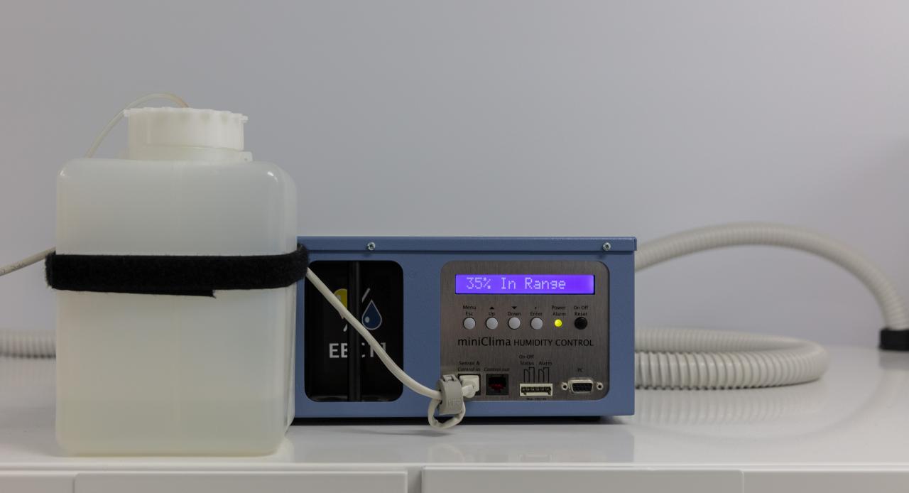 miniClima EBC11 (miniClima Schönbauer GmbH) humidity control unit maintaining low humidity for a weeping glass storage cabinet