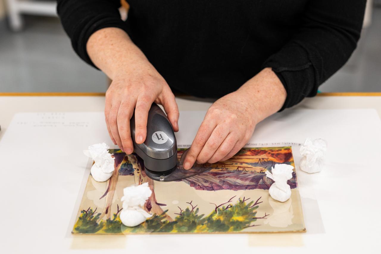 Conservators monitor and measure colour change and fading of artworks using a handheld spectrophotometer. This allows conservators to assess and quantify change over time and develop display guidelines for artworks that are sensitive to light.
