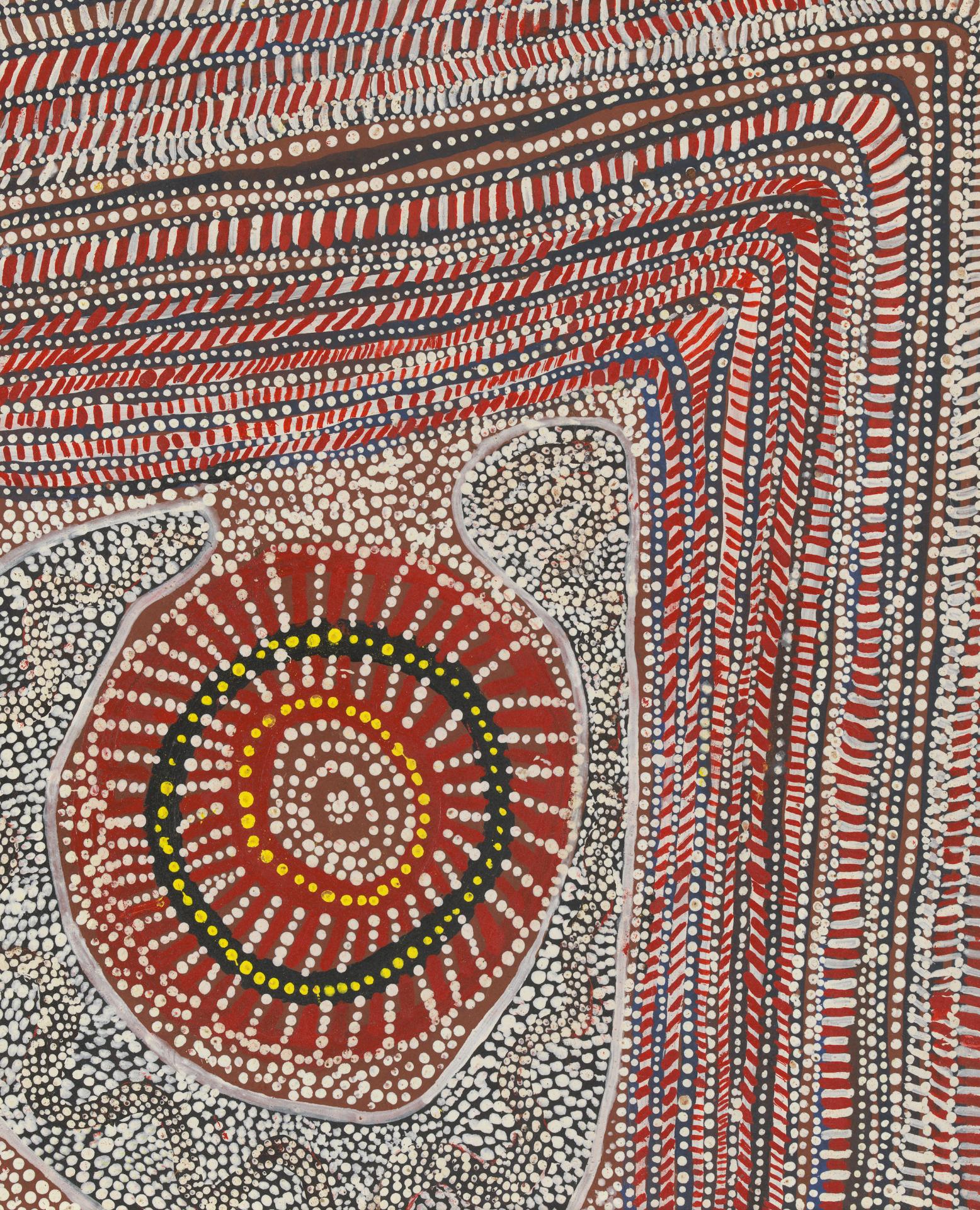 The following year the community started to display their work around Australia and chose the name Papunya Tula for their art company, which is the name of two small hills not far from Papunya and means a ‘meeting place for all brothers and cousins’ – it is a shared Honey Ant dreaming site for groups in the Western Desert region. This inclusivity in their name is particularly important as Papunya was not the traditional country for the peoples who lived there; it was established in 1960 when the government forced Aranda, Anmatyeree, Luritja, Warlpiri and Pintupi peoples off their land and to Papunya. The Papunya Tula Artists and Papunya Tjupi Arts continue to produce work with an international reputation and a strong cultural connection to Country.