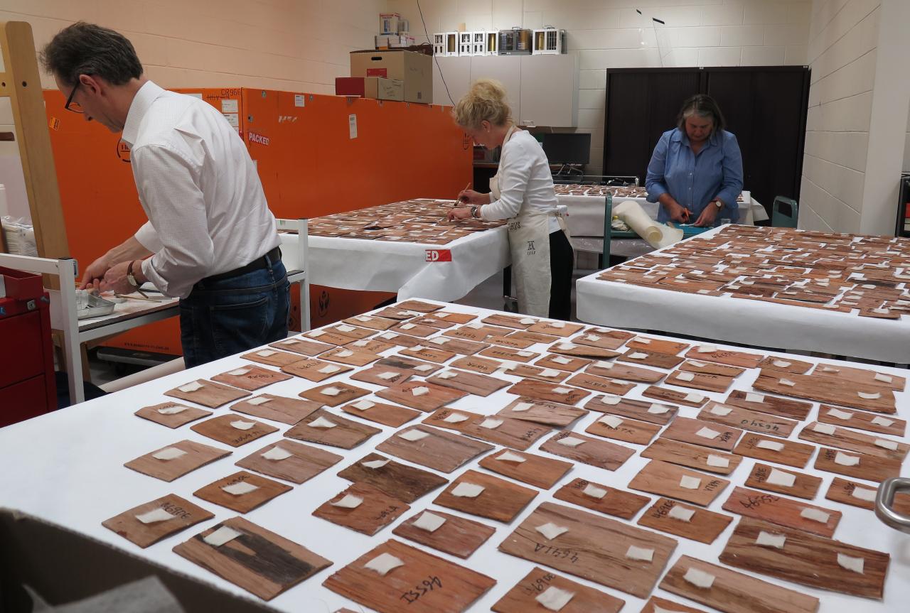 To secure artworks safely for open display, conservators work with Conservation Art Technicians. This involves preparing display mounts for supportive purposes such as an understructure for a historic sofa with a weakened leg, or making clips to hold a porcelain plate on the wall and provide additional security. Additionally, works on paper are mounted and framed in standard or customised frames by the Conservation Art Technicians ready to hang for exhibition. We also assist the Exhibition Design department by testing proposed materials for use in new exhibitions or displays, ensuring there are no damaging volatile organic compounds or other chemical components.