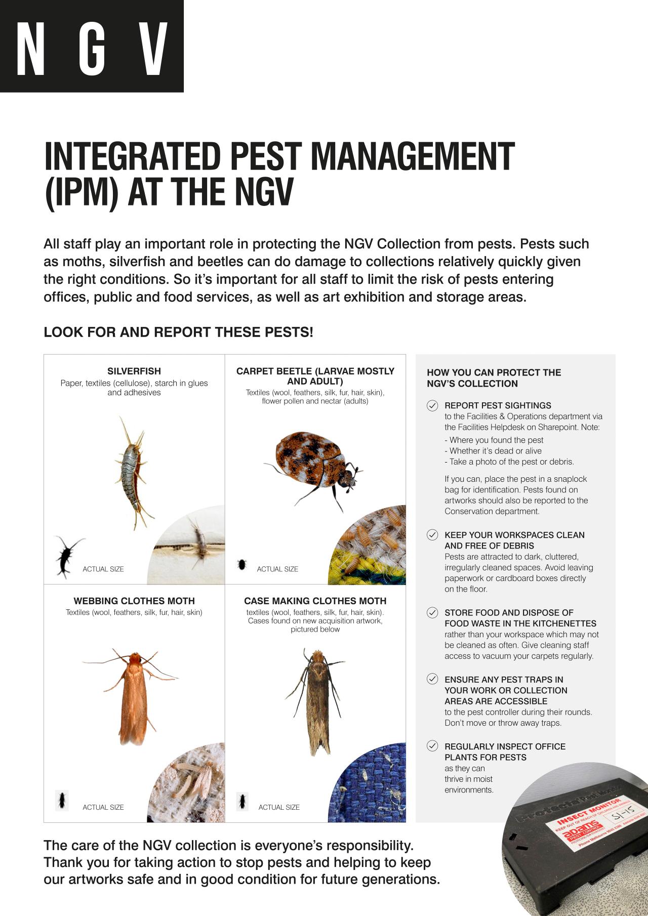 The Assets & Facilities and Conservation departments monitor the results of regular inspections by professional pest management services, and advise on risks to artworks and proposed treatments where necessary. Pests can range from wood borers to silverfish, and treatments used to remove these pests are tailored according to pest mortality data and the artwork materiality. Pest treatments are generally undertaken on-site for new artworks entering the collection, or as part of our biosecurity obligations under the Quarantine Act 1908. The Conservation department uses low-temperature (freezing) treatments for smaller objects, and low-oxygen treatments (using nitrogen gas) for larger or more complex artworks.