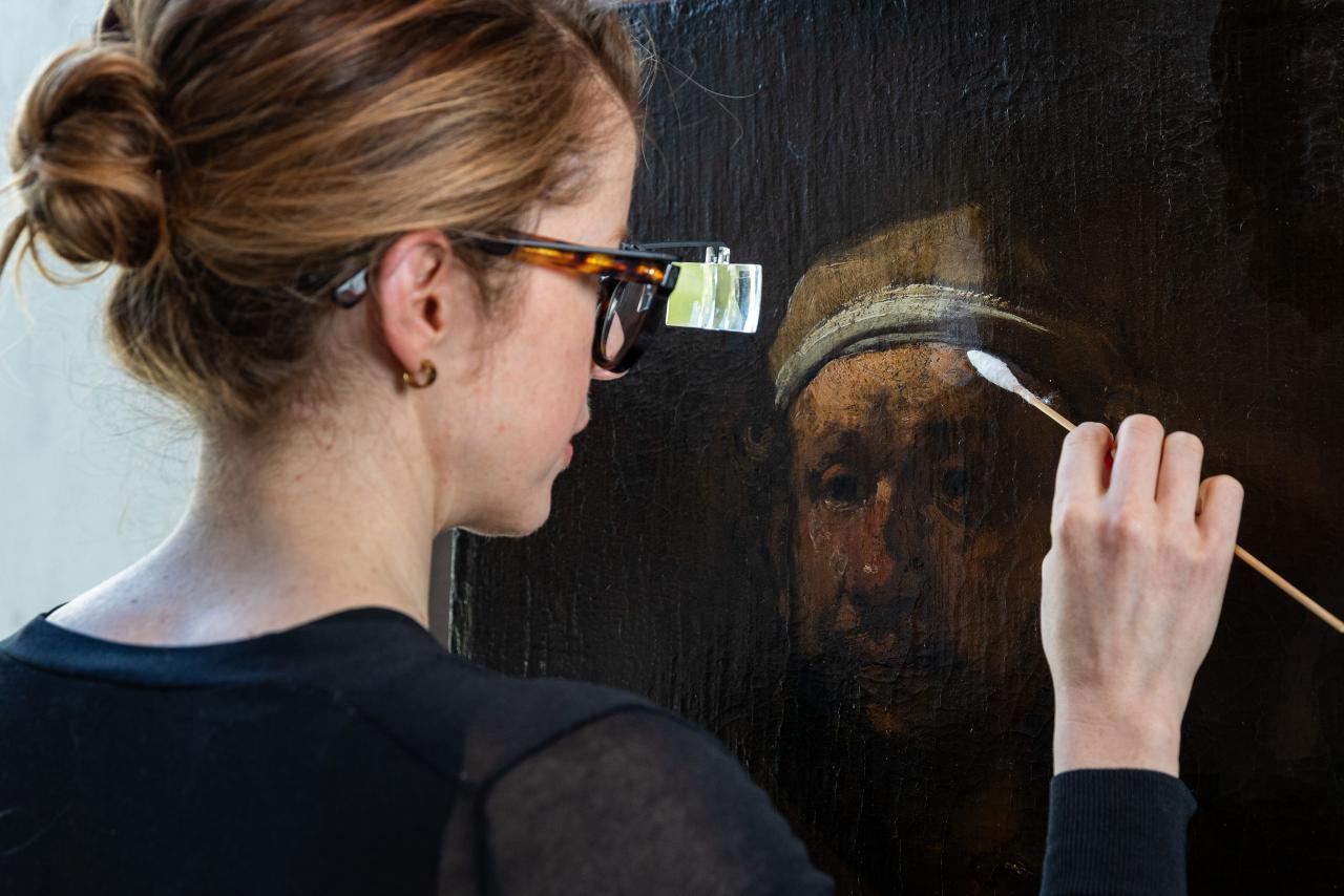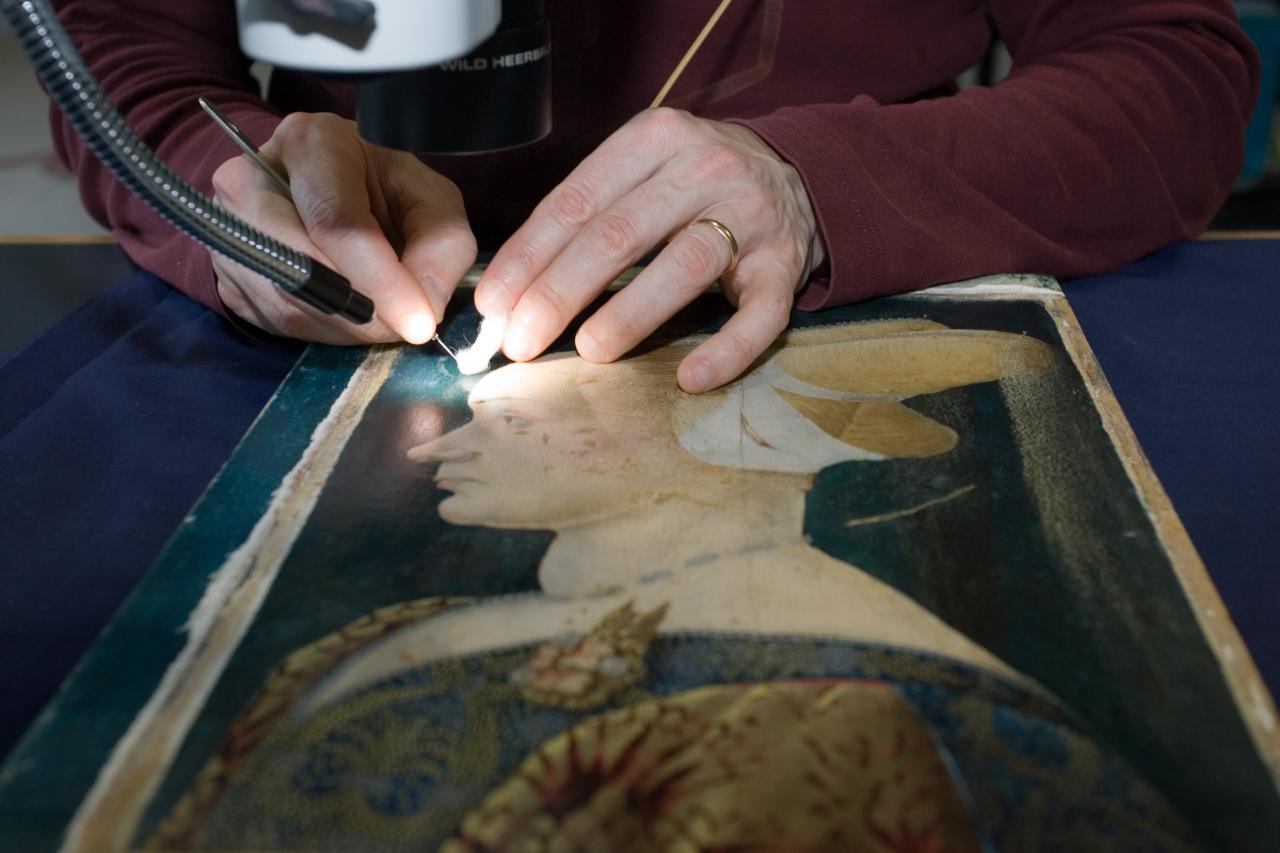 The studio maintains a work program centered around practical conservation treatments. Recent major projects include the Rembrandt studio portrait of Rembrandt, James Tissot’s An Interesting Story, Marie-Victoire Lemoine’s A young woman leaning on the edge of a window, El Greco’s Portrait of a Cardinal (St. Bonaventure), Murillo’s Immaculate Conception, Constance Stokes’ Portrait of a woman in a green dress, and Peter Upward’s Untitled (Blue).