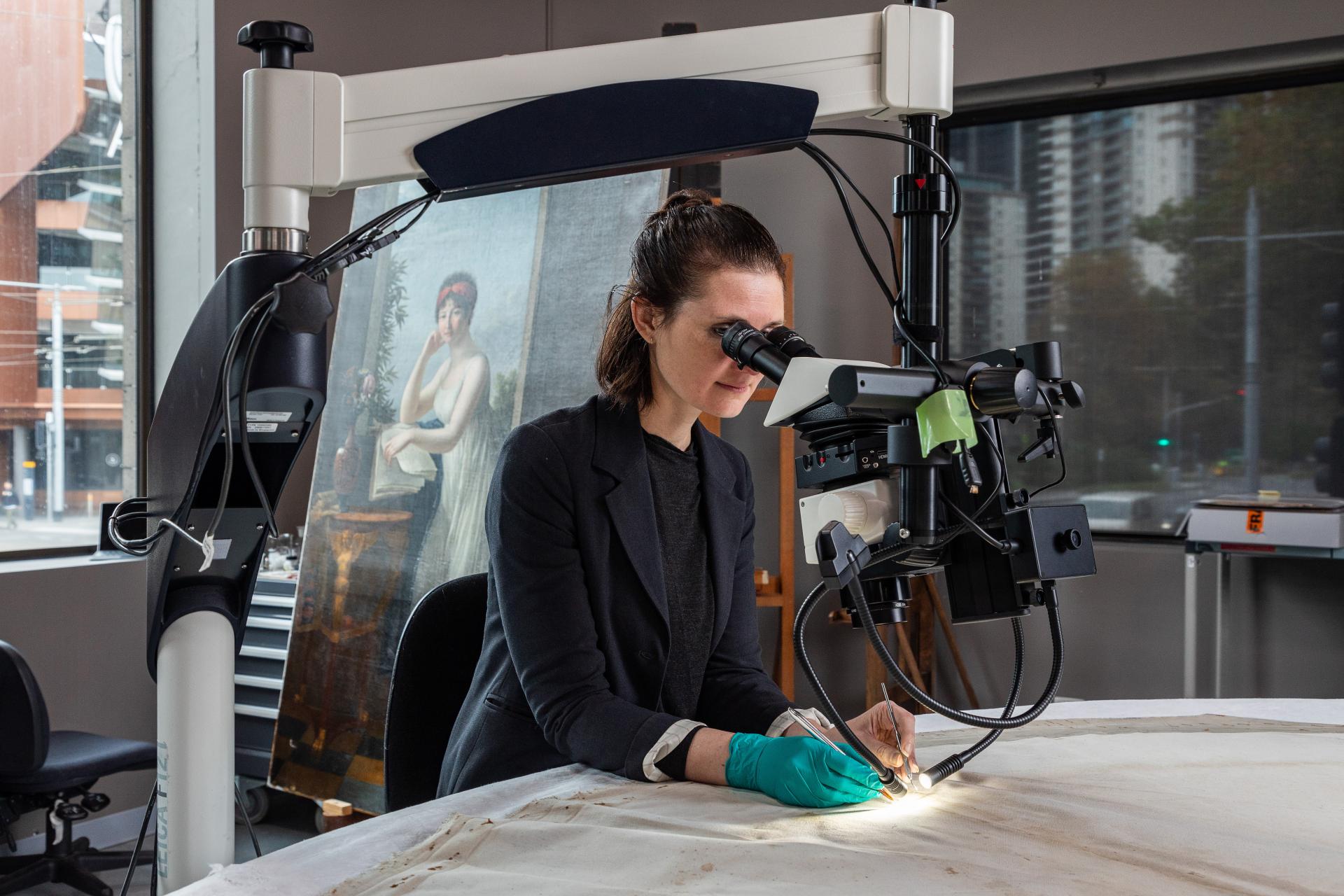 Alongside practical treatments, the studio is involved in technical research. Current research projects include a database compiling the materials and techniques of living artists featured in the NGV collection sourced from the artists themselves; an in-depth technical survey of paintings by British artists in the NGV as part of the Gallery’s British Collection Online project; and a research project documenting the use of varnishes by Australian artists.