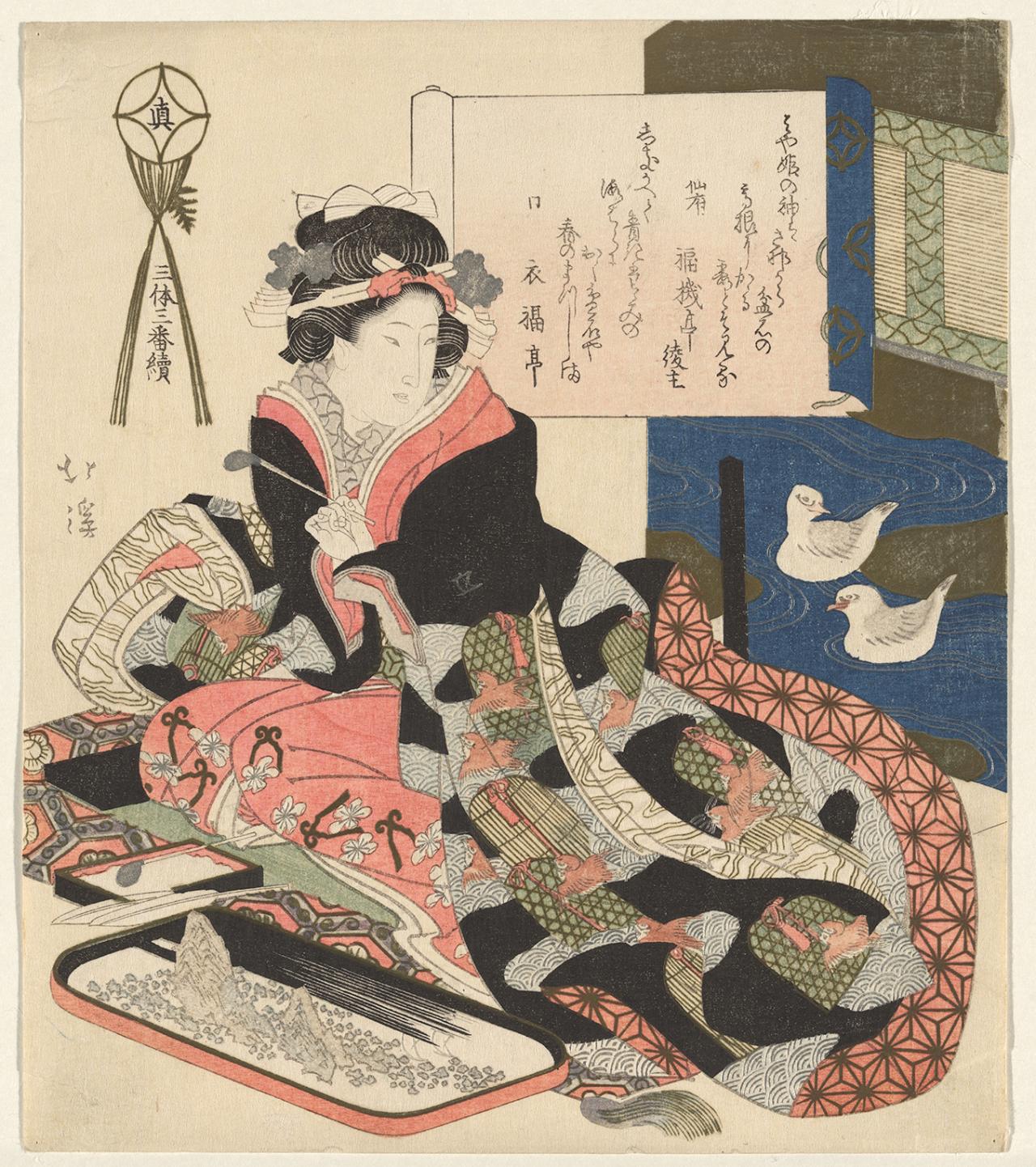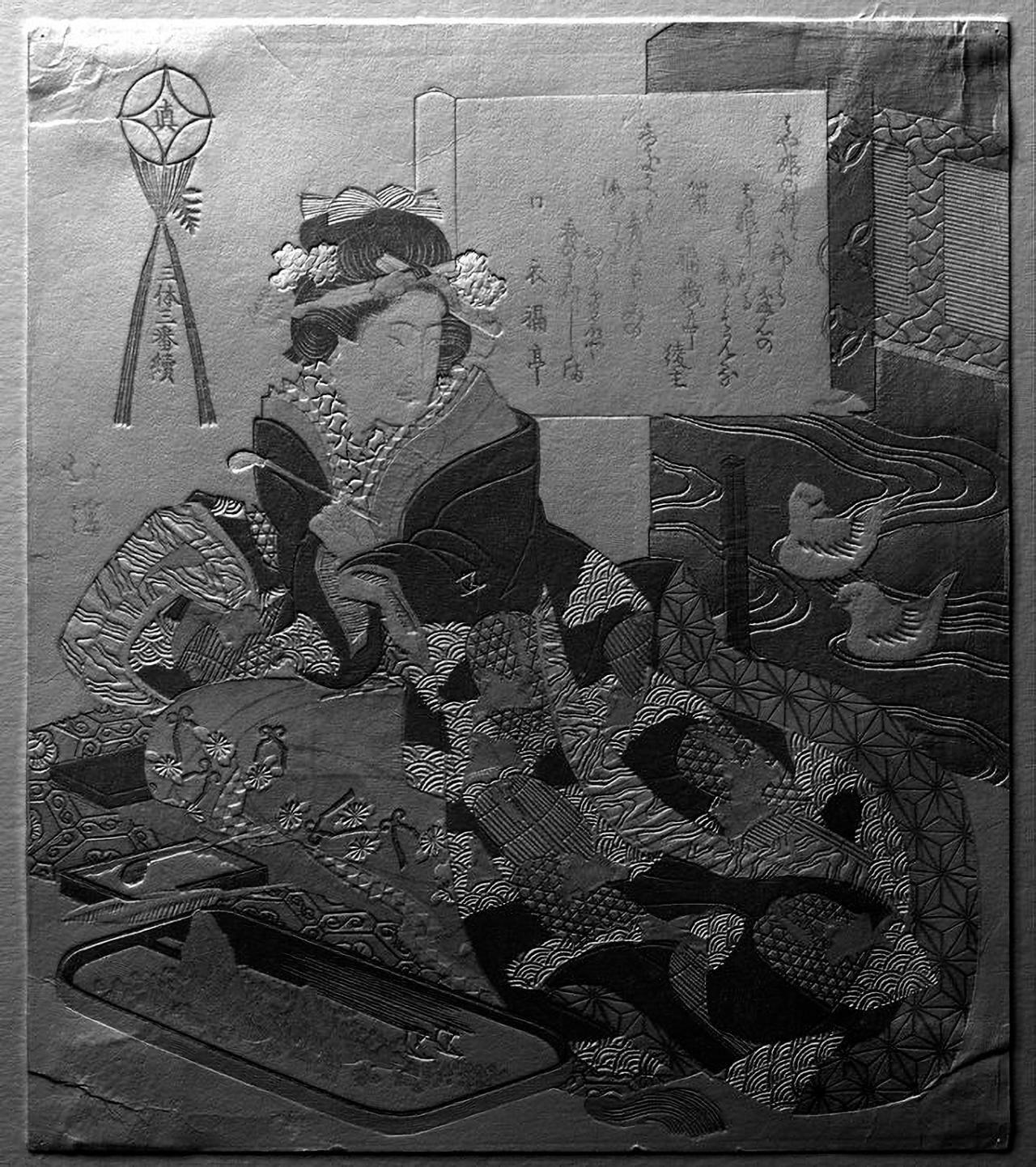 Reflectance Transformation Imaging (RTI) is a photographic method where an object is documented multiple times with light falling onto its surface at different angles. When compiled together using RTI computer software, an interactive image is produced that allows close surface examination. This example of a RTI image is of a print by Japanese artist, Totoya Hokkei, depicting a woman making miniature landscape. With RTI, any undulations and creases in the paper become apparent as well as the decorative blind embossing technique known as karazuri in Japan.