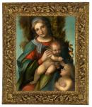 Painted in the early 1500s, this picture offers new insights into the development of the young Correggio, and the extent to which he was prepared to experiment with form, design and emotion in his work. The composition is partly based on Leonardo’s versions of the subject showing Christ wriggling out of his mother’s arms, but the gesture of Christ blessing John with a caressing hand to the head is Correggio’s own invention. The soft, wispy effects of hair and foliage present a gentle alternative to the crystalline forms of Francia in his version of the subject seen nearby.