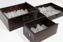 glass, wooden boxes, transparent synthetic polymer resin, metal