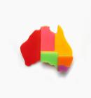 Three-dimensional map of Australia brooch of multi-coloured Perspex layers with metal pin fastening adhered to rear.