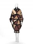 Hand-knitted wool and mohair dress with wide dolman sleeves which taper into narrow cuffs. Knitted with triangular geometric design in black, white, beige and ochre with black and white neck, hem and cuff bands.