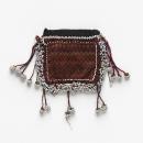 Square cloth bag with an opening at the top, decorated overall with geometric patterns worked in embroidery in multi-coloured silk thread. Edges are decorated with beaded fringe with four groups of beaded tassels. The bag is finished with a cotton band and drawstring.