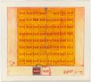 soft-ground etching and aquatint printed in yellow and red ink on handmade paper and collage of stencil plate, string and aluminium pin