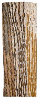 Barrupu represents the Gumatj miny’tji (sacred design) that embodies gurtha (fire). The Gumatj language, Dhuwalandja, is itself known as the tongue of flame and is believed to incinerate dishonesty. Early bark paintings by Yolŋu men often show this diamond pattern as ordered and tight. These works by Barrupu, however, are characterised by the artist’s spontaneity and gesture. Horizontal and vertical lines represent different intensities of flame, smoke and ash. Barrupu shows the fire in a macro view, close-up and intense, stressing its importance to the Gumatj people. Since her passing, Barrupu has been known as ‘fire lady’, recognising her connection to gurtha and her experimental aesthetic that pushed the design in new directions.