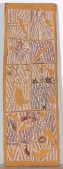 Bayngul divides the painting into separate panels edged in yellow ochre and encloses the composition in a yellow ochre border. Three of the upper section panels represent the sacred sand goanna, Djanda observed and named by the Djang’kawu Sisters after they arrived at Yalangbara (Port Bradshaw) in the Wangarr (Ancestral period). The other sections contain carefully observed and beautifully delineated Rirratjingu flora and fauna set against the Rirratjingu miny’tji of parallel lines of crosshatching believed to signify Djanda moving through the sand at Yalangbara.