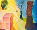 colours (hues or tints) lines (artistic concept) patterns (design elements) rock (inorganic material) shape (form attribute) square (shape) trees
