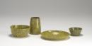 Six earthenware vessels decorated in yellow and black zigzag pattern.