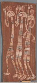 Jimmy Midjawmidjaw represents slender female Mimih spirits of the Stone Country engaging in a lithesome ceremonial dance. The faces, limbs and torsos of these beings credited with teaching Kunwinjku people how to hunt, make love, dance, sing and paint, are lightly embellished with crisscross and horizontal markings that allude to customary ritual. The positioning of the figures’ arms and feet suggests uninhibited movement, and the clear delineation of their ample breasts accentuates their femaleness. They are painted in the old East Alligator River style, exemplified by rock paintings from Deaf Adder Creek and Nourlangie Rock in Western Arnhem Land.