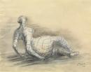 From his student days at the Royal College of Art, Henry Moore was a keen draughtsman, attending drawing classes that his fellow sculpture students just as keenly avoided. Drawing was an essential intermediary stage in the creation of Moore’s sculptures until his later years, when it became an art form independent of his three-dimensional work. A calm grandeur, evident in his sculptures, is similarly present in Moore’s drawings and emerges from the rounded volumes created by his careful modelling and the stately figures, which are rarely in action but rather standing, sitting or reclining. Reclining figure distorted – sectional line is a study for the bronze Reclining figure no. 7, 1979–80.