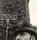 inscribed in blue ballpoint pen on reverse u.l.: Rev. Michael Scott urges a packed Trafalgar Square to sit on the / streets of Central London.