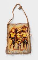 Naup Waup’s History bag explores how Indigenous people have often been viewed in the Western world, with little understanding of the complexities of their cultures. The photograph on the front, taken by missionaries working in Papua New Guinea during the 1930s, is seen by Waup as representing only the surface layer of his people, without their spiritual essence. The tapa element of this work recalls the first tapa bag made by Waup’s people many generations before, which also symbolises the womb. By honouring these customary objects while reimagining them through digital printing, Waup challenges exoticised representations of indigenous people and reasserts the spiritual and cultural significance that lies beneath such images.
