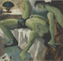 beds (furniture) knives lamps (lighting devices) men (male humans) Samson and Delilah (Old Testament narrative) weapons women (female humans)