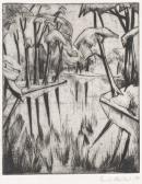 This drypoint was made in 1914, just before the outbreak of the First World War. Like many of Erich Heckel’s prints from this period, Lake in a park is based on an oil painting from the same year, with the composition reversed in the print. The work likely depicts a small park lake in Dilborn in the lower Rhine area, where Heckel spent the spring of 1914 with painter Heinrich Nauen. In the print, Heckel subtly alters the composition of his earlier painting, incorporating stylistic elements such as simplified silhouettes and crystalline forms that evoke the nave of a Gothic cathedral.