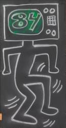 These two panels originally formed part of the DJ booth at the Hardware Club in Melbourne, and were painted by Keith Haring during his visit in 1984. Haring was invited to Australia to undertake a series of public street art projects, including a temporary mural on the Waterwall at the National Gallery of Victoria and a mural in Collingwood. These panels show Haring’s trademark images of ‘man with television head’ and ‘dancing dog’, painted in a bi-chromatic scheme of fluid white lines on a black background. Haring developed his images and techniques as a graffiti artist in the subways of New York.