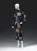 Long sleeved dress in permanent pleated polyester with geometric panels of black, grey, navy blue, chocolate, bronze and beige. Fastening at the centre back with a single button.
