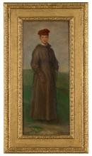 This painting of a female figure dressed in a heavy overcoat is a small version of G. F. Watts’s large, full length portrait of May Hichens (nee Prinsep), 1853–1931. The larger painting which was exhibited at the Royal Academy in 1879 with the title Mrs Andrew Hichens, and is now in the Manchester Art Gallery. The distinctive outdoor garb worn by the sitter in this painting has lent the painting its title, The Ulster coat.