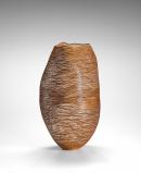 Morigami Jin was born in the bamboo-producing town of Beppu to parents who were also bamboo artists. His work Big wave is a simple and elegant basket that has been made with an irregular combination of twined (nawame) and twill (ajiro) plaiting. Its large, undulating shape and woven horizontal weave – which gives it a slightly see-through appearance – create a rhythm of lines that give the impression of flowing water or ocean waves.