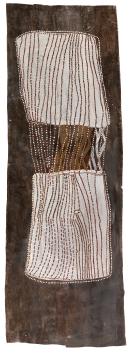 This work represents Baratjula, the Madarrpa clan estate adjacent to Cape Shield where the Mundukul, the lightning snake, lives deep beneath the sea. The artist shows the sacred rock set in deep water between the electric ‘curse’ that the snake spits into the sky in the form of lightning, and the spray of the sea trying to shift the immovable rock foundation of the Madarrpa people. The scale of Lightning in the Rock captures the intensity of the narrative: at the time it was painted, it was one of the largest bark panels ever made, a testament to Ms N. Marawili’s bold and experimental practice.