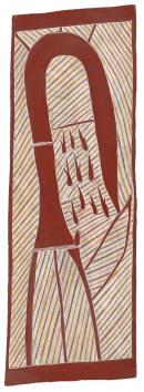 In this bark painting, Philip Gudthaykudthay represents Garrtjambal, the kangaroo, a significant totem of Ramingining. The artist has silhouetted elements of the kangaroo over a crosshatched grid, emblematic of Garrtjambal’s journey to Ramingining from the east and the terrain he passed through. Garrtjambal came from the eastern side of the Glyde River with the northeast wind, being chased by dogs. As he went through the jungle his tail was caught in a spider web that marked his skin with a sacred rain cloud pattern. He came upon a creek line and dug a hole in the ground that became a slow spring. He then became the land. There is a hill called Dungundha that is his head and the even, slightly sloping land of the town of Ramingining is the white fur on the kangaroo’s chest.