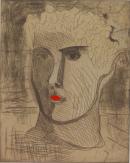 etching ad roulette printed in brown and white inks on chine collé with collage of red paper