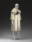 (a) label, centre back neckline, woven in black on white silk: BALENCIAGA / 10 AVENUE GEORGE V PARIS