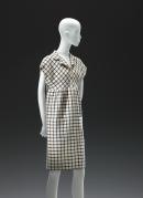 label, centre back neckline, woven in black on white silk: BALENCIAGA / 10 AVENUE GEORGE V PARIS