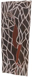 This work represents Mundukul, the Lightning Snake, who lives deep beneath the sea at Baratjula, the Madarrpa clan estate. This design shows the deep water and the ‘curse’ or oath that the snake spits into the sky in the form of lightning. This work shows the sanctifying words being spat across the sky in lightning form and the lightning’s sacred power hitting the sea spray. Yurr’yunna is the word used to describe the rough waves topping the rock and the spray flying into the sky.