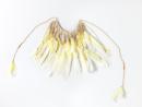 Discarded and gifted yellow and white sulphur-crested cockatoo feathers, cotton string fibre, yellow and white ochre.
