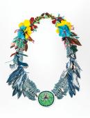 synthetic polymer paint on canvas, synthetic thread, synthetic wadding, synthetic fabric, wing seeds, shells, plastic, synthetic ribbon, copper, painted copper, painted metal, wood, nylon cord, painted plastic, coral, kulap seeds, steel, wongai seeds