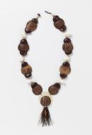 coconut, kulap seed, shell, timber, waxed cotton thread, plastic bead, cassowary feather