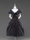 Zerline is a key work from Christian Dior’s final collection. Incorporating skilfully arranged crisp silk taffeta in jet black with a dramatic shawl collar to frame the wearer’s décolletage, Dior completes the look with an oversized black silk rose corsage. Zerline proves again how central the use of black in all its forms has been to the creation of magnificent Dior designs.