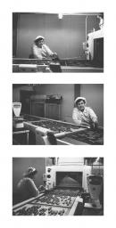typed on accompanying paper label: GEORGINENA MARIOLIS / Job description as given by management: / “Georginena is responsible for separating approximately / 300 chocolate bars per minute on the belt of the / chocolate enribing machine, ensuring the right number / of biscuits on plaques, and checking for mechanical / breakdown in the tunnel and broken wires on the machine. / Mrs. Mariolis is engaged on rotating duties like the / rest of the girls. She finds the work intesting and / is happy with her job.” / GEORGINENA MARIOLIS came from Greece / in 1968. She has worked in factories / for 12 years and at her present job / for 4 years.