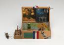 wood, paper, ribbon, plastic, metal, butterfly wing and resin on mirror, alcohol in glass bottle, feathers