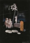 collage of cut offset lithographs and gouache on black paper