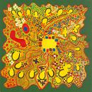 inscribed in blue fibre-tipped pen on reverse c.; Cosmo Newberry / Settlement / Green border represents Brush Fence / erected in the Penal Settlement days / under supervisor DONOVAN / Painted by / Dolly Walker (Puhungha Wagabu) / 2004