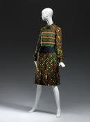 Green patterned ensemble of vest, shirt, skirt and belt. The shirt and skirt have two different printed patterns with similar motifs, while the knitted vest features alternating stripes of yellow, green and brown wool with black rib at the shoulders and waistline. Worn with a black leather belt over the vest. The shirt has a pointed collar and the skirt is box pleated.