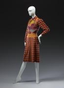 Long sleeve dress with high collar, button down front, box pleated skirt to mid-calf worn under multi-coloured vest and burgundy leather belt. The dress is patterned with camel, red, oyster and green on a black ground.
