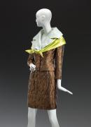 The jacket and skirt suit ensemble is made in brown and gold woven silk fabric. The jacket has a grey notched collar and three pink and orange rhinestone buttons fastening to the proper left side and six of the same button decoratively placed at the back. The straight skirt finishes above-the-knee. A wide silk satin chartreuse scarf is worn wrapped over the jacket under the lapels.