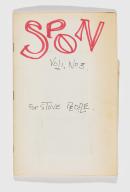 artist's book: red fibre-tipped pen, pen and ink, collage of printed clippings and found handwritten notes, paper cover, stapled binding